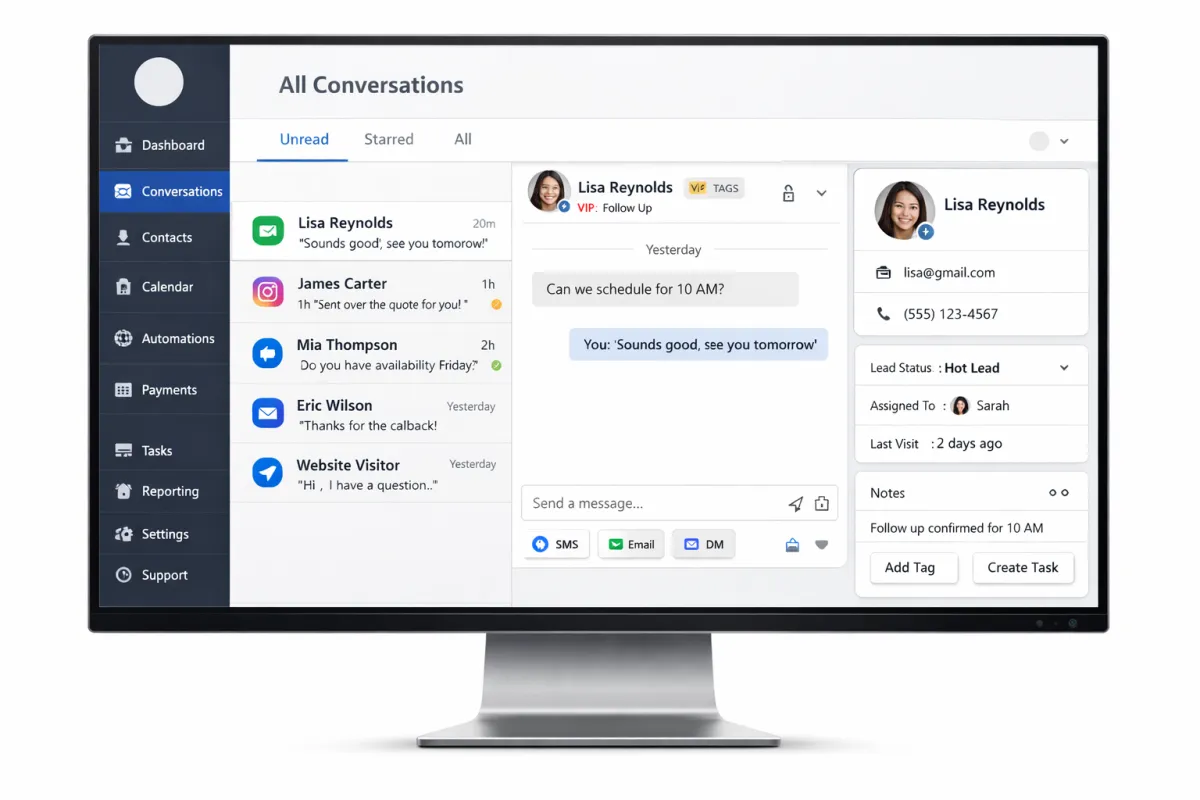 Stop bouncing between Instagram DMs, Facebook messages, texts, emails, and web chat. Your team responds from one place so leads don’t slip, replies don’t stall, and follow-up stays consistent.